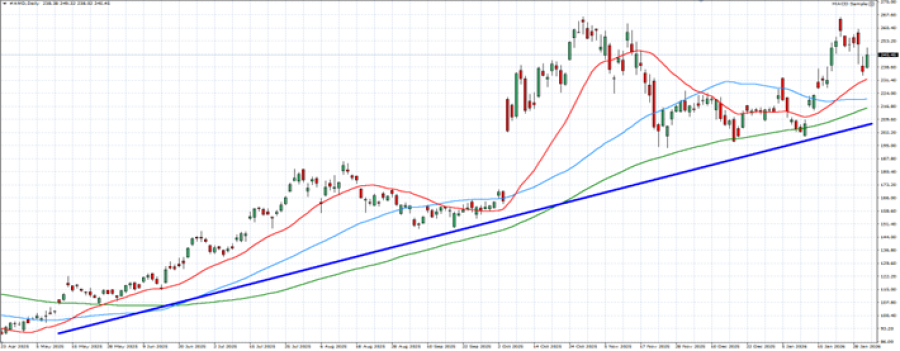 - DNEVNI POKRETNI PROSECI SIGNALIZIRAJU UZLAZNI TREND: cena akcija je porasla iznad 20-dnevnih, 50-dnevnih i 100-dnevnih pokretnih proseka, što ukazuje na nastavak uzlaznog trenda. Međutim, taj bi se trend mogao preokrenuti ako cene padnu ispod tih ključnih proseka.