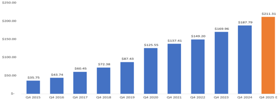 - PRODAJA JE RASLA U SVAKOM ČETVRTOM TROMESEČJU U POSLEDNJIH 10 GODINA. Grafikon u nastavku pokazuje da je između 2015. i 2024. prodaja u četvrtom tromesečju kontinuirano rasla, sa 35,75 milijardi USD u 2015. na 187,79 milijardi USD u 2024. To znači da je prosečna godišnja stopa rasta oko 21%.