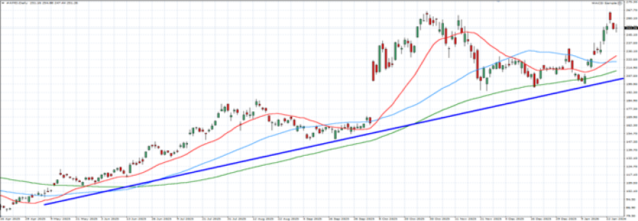 - DNEVNI POKRETNI PROSECI SIGNALIZIRAJU UZLAZNI TREND: cena akcija je porasla iznad 20-dnevnih, 50-dnevnih i 100-dnevnih pokretnih proseka, što ukazuje na nastavak uzlaznog trenda. Međutim, taj bi se trend mogao preokrenuti ako cene padnu ispod tih ključnih proseka.