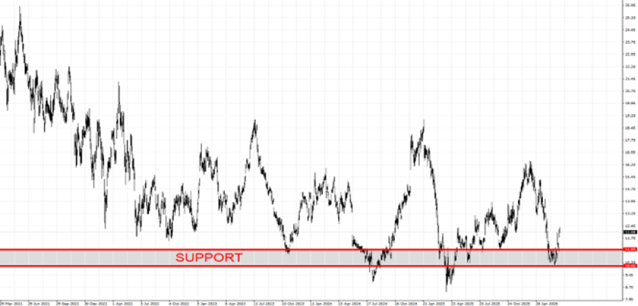 - ZONA PODRŠKE: 11 - 10 USD. Cena akcija dosledno pronalazi snažnu podršku u rasponu od 11 do 10 dolara barem od oktobra 2023. Međutim, i dalje postoji rizik od potencijalnog proboja ispod te razine ako se promene tržišni uslovi.