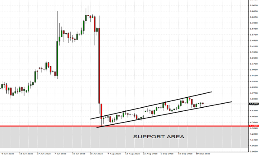- PODRŠKA NA 4,33 USD: Cene bakra su testirale oznaku od 4,33 dolara početkom avgusta 2025, kreirajući kratkoročnu podršku. Od tada se cene bakra uglavnom kreću iznad podrške od 4,33 dolara.