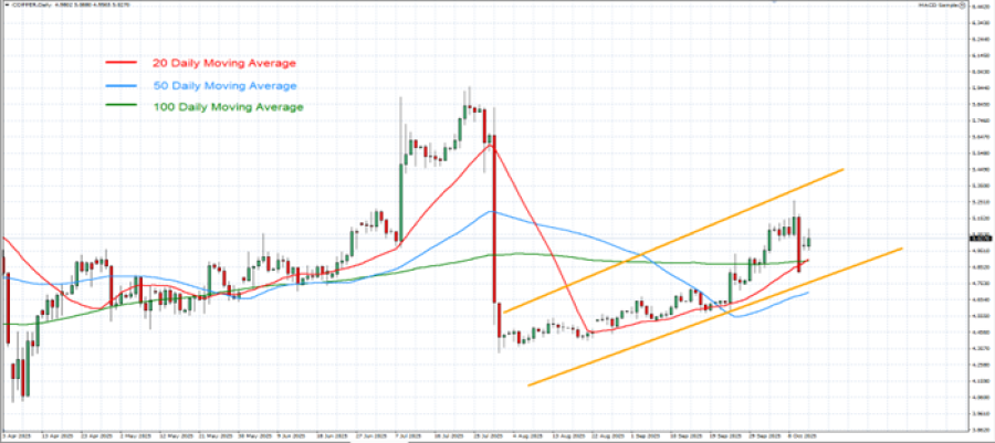 - UZLAZNI TREND I OPORAVAK OD POČETKA AVGUSTA 2025: Cene bakra se kreću u uzlaznom trendu od početka avgusta, kao što je prikazano na dnevnom grafikonu u nastavku. Međutim, i dalje postoji rizik od potencijalnog proboja ispod te razine ako se promene tržišni uslovi.