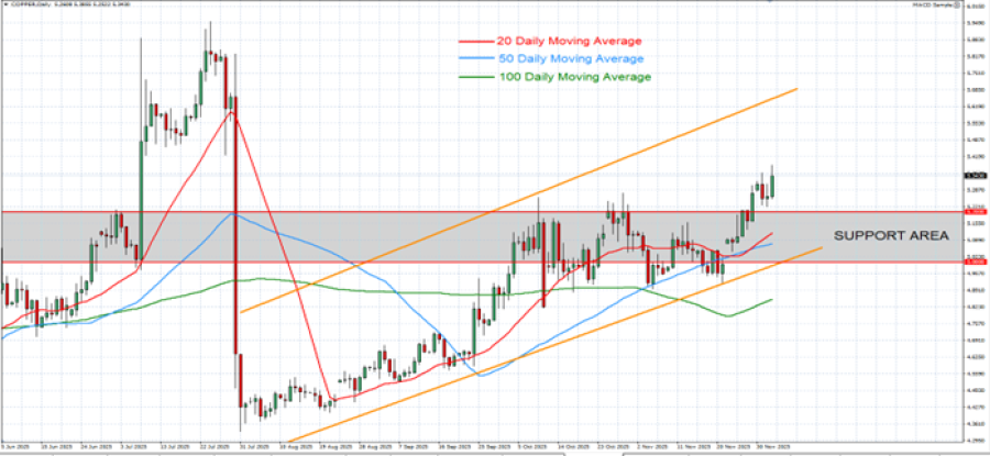 - ZONA PODRŠKE: 5,20-5,00 USD. Od početka oktobra 2025. cene bakra zadržavaju snažnu podršku u području od 5,00 do 5,20 dolara.