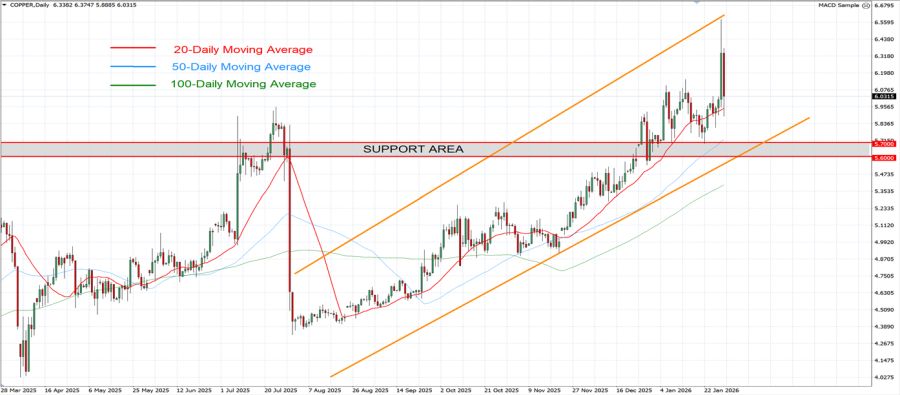 - DNEVNI POKRETNI PROSECI UKAZUJU NA UZLAZNI TREND: Cene bakra nedavno su se kretale iznad 20-, 50- i 100-dnevnih proseka kretanja, što ukazuje na kontinuirani uzlazni trend. Međutim, cene takođe mogu da promene svoj trend ako padnu ispod 20-, 50- i 100-dnevnih proseka kretanja.