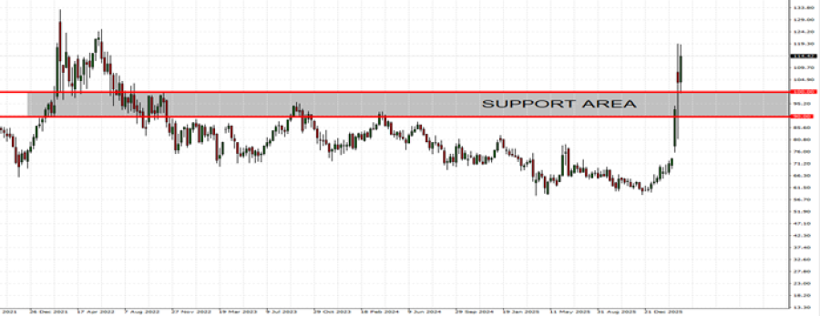 - ZONA PODRŠKE: 90-100 USD. Nakon što su porasle na najvišu stopu od juna 2022. (119,43 USD), cene nafte brent sada su pronašle podršku između razina 90 i 100 USD. Sirova nafta porasla je za oko 63% od početka rata, dosegnuvši cene koje nisu viđene u gotovo četiri godine i podigavši tržište iznad 100 dolara.