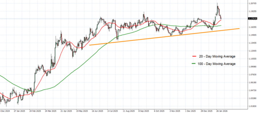 - DNEVNI POKRETNI PROSECI: Par se kreće iznad svojih ključnih pokretnih proseka. 20-dnevni pokretni prosek (crvena) ponovo je porastao, signalizirajući nastavak uzlaznog zamaha. 100-dnevni pokretni prosek (plava) nastavlja kretanje prema gore, jačajući ukupnu stabilnost trenda.