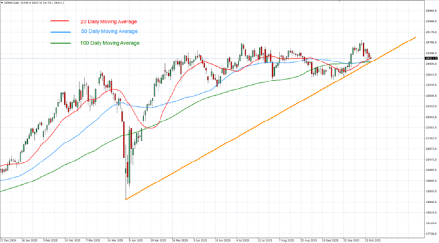 - GER40 OSTAJE IZNAD 20-DNEVNIH, 50-DNEVNIH I 100-DNEVNIH PROSEKA KRETANJA: Dnevni grafikon u nastavku pokazuje da je GER40 i dalje iznad dva tehnički važna proseka kretanja, što ukazuje na kontinuirani uzlazni trend. Ipak, trend bi se mogao preokrenuti ako cene padnu ispod tih proseka.