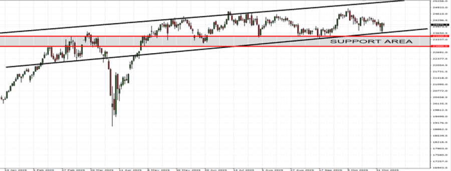 - PODRUČJE PODRŠKE: 23,000 – 23,5000. Prema donjem grafikonu, GER40 zadržava snažnu podršku u području između 23.000 i 23.500, barem od maja 2025.