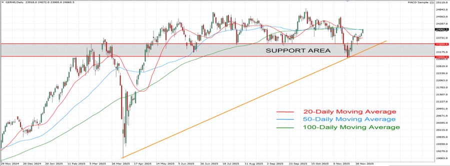 - ČETVRTAK, 18. DECEMBRA U 13:15 GMT): ODLUKA EVROPSKE CENTRALNE BANKE (ECB) O SMANJENJU KAMATNE STOPE. Očekuje se da će ECB zadržati stope nepromenjenim, jačajući finansijsku stabilnost u 2026. godini. Snažan politički stav pokazaće poverenje u ekonomsku putanju evrozone i pomoći u održavanju povoljnih uslova finansiranja za nemačke korporacije. Takva stabilnost obično povećava interes investitora za akcije, pružajući podršku za dalji rast indeksa GER40. (trenutna stopa: 2,15%)