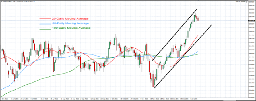 - GER40 OSTAJE IZNAD 20-DNEVNIH, 50-DNEVNIH I 100-DNEVNIH PROSEKA KRETANJA: Dnevni grafikon u nastavku pokazuje da je GER40 i dalje iznad dva tehnički važna proseka kretanja, što ukazuje na kontinuirani uzlazni trend. Ipak, trend bi se mogao preokrenuti ako cene padnu ispod tih proseka.