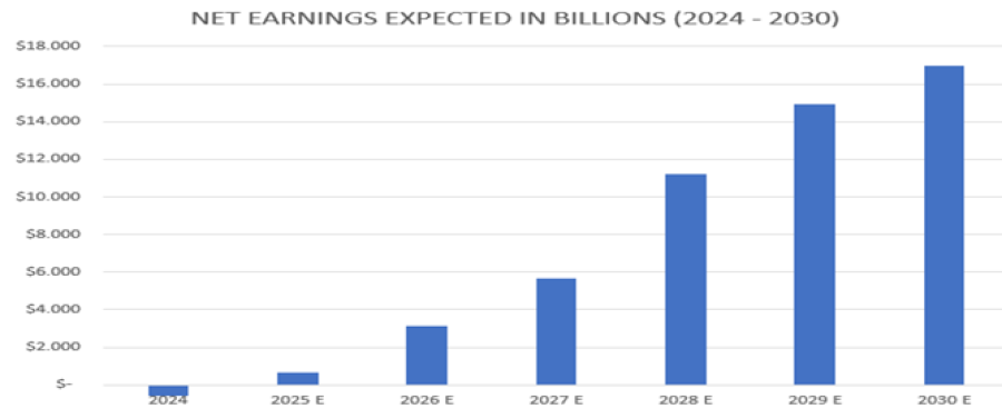 - NETO PRIHOD (2024-2030): OČEKUJE SE DA ĆE DO 2030. NETO PRIHOD KOMPANIJE RASTI U PROSEKU ZA 138,19% GODIŠNJE. Očekuje se da će neto prihod porasti s negativnih 566 miliona USD u 2024. na 17 milijardi USD u 2030.