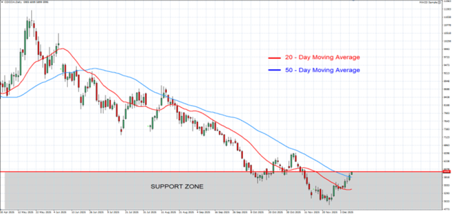 - ZONA PODRŠKE: 6000 USD. Od oktobra 2025, nakon testiranja područja ispod 6000 dolara, cene kakaa su se vraćale iznad 6000 dolara, što ukazuje na moguću podršku.