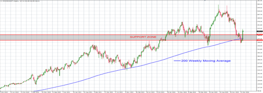 - PODRUČJE PODRŠKE NA NIVOU OD 400 DO 370 DOLARA: Nedavni pad vratio je Microsoft na ključno područje podrške između 400 i 370 dolara. Sada su akcije ponovo porasle iznad 200-dnevnog pokretnog proseka, koji je delovao kao dugoročna podrška, jačajući ovu zonu kao ključnu tehničku zonu.