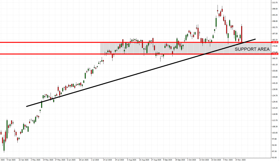 - ZONA PODRŠKE: 180 - 170 USD. Od jula 2025. cena akcija se održava u zoni jake podrške između 180 i 170 dolara.