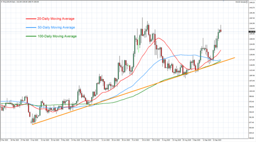 - CENA PALADIJUMA IZNAD 20-DNEVNOG, 50-DNEVNOG I 100-DNEVNOG POKRETNOG PROSEKA: Cena paladijuma ostaje iznad svojih dnevnih pokretnih proseka, što ukazuje na potencijalni uzlazni trend. Trend se može preokrenuti ako paladijum padne ispod tih proseka.