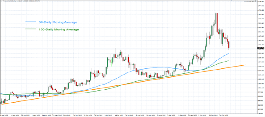 - UZLAZNI TREND OD APRILA 2025: Kao što se može videti sa dnevnog grafikona ispod, paladijum je u stabilnom uzlaznom trendu uz podršku uzlazne dijagonalne linije trenda (narandžasta) od aprila. Međutim, cena bi mogla pasti.