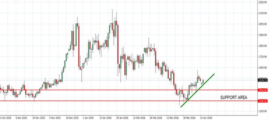 - KRATKOROČNI TREND JE RASTUĆI. Od oktobra 2025. paladijum je nekoliko puta odskočio iz zone jake podrške. Krajem marta dogodio se još jedan skok, a cena je od tada ostala u stalnom porastu (zelena linija trenda).