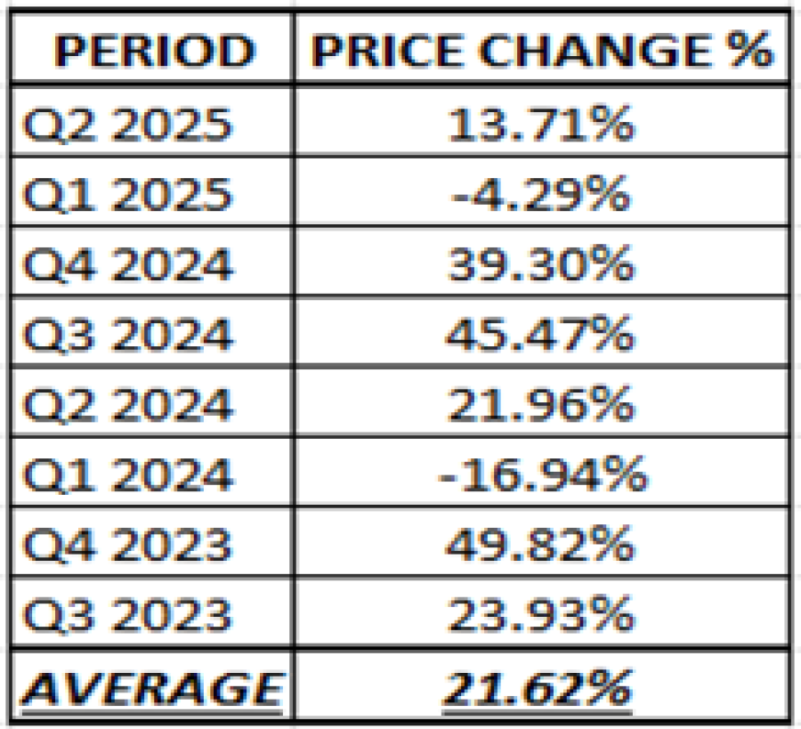 - UČINAK AKCIJA (U POSLEDNJIH 8 TROMESEČJA): CENA AKCIJA RASLA JE U PROSEKU ZA 21,62% U SEDMICI NAKON OBJAVLJIVANJA TROMESEČNIH IZVEŠTAJA. Tablica u nastavku pokazuje da je cena akcija pala samo dva puta od ukupno 8 u roku od sedam dana od objavljivanja finansijskog izveštaja. Iz tablice se takođe vidi da je cena akcija rasla u proseku za 21,62% u roku od sedam dana od objave izveštaja. Palantir je izveštaj za 2. tromesečje objavio 4. avgusta 2025, a cena akcija porasla je za 13,71% u narednih sedam dana.