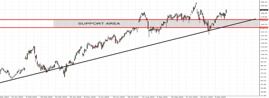 - JAKA ZONA PODRŠKE KREĆE SE OD 175 DO 160 DOLARA. Od jula 2025. cena se održava u rasponu od 175 do 160 dolara.