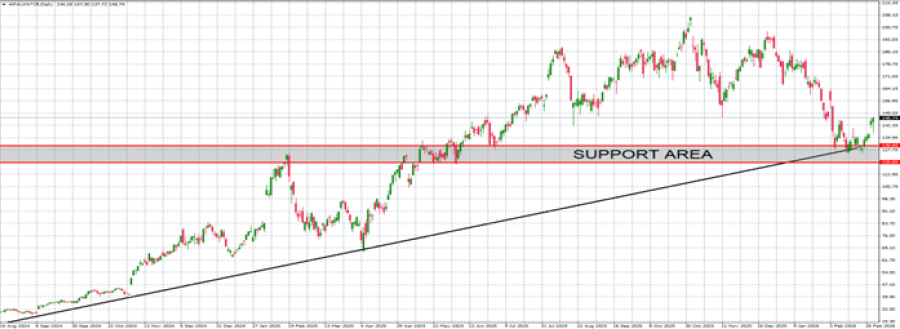 - ZONA PODRŠKE NA NIVOU 130-120 USD: Nedavno povlačenje dovelo je Palantir u ključnu zonu podrške između 130 i 120 dolara, gde se takođe održava uzlazna linija dugoročnog trenda (crna linija). Ovo je područje nedavno testirano, što ga je učvrstilo kao glavni nivo tehničke podrške.