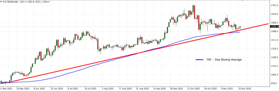- DNEVNI POKRETNI PROSEK (MA): Cena ostaje iznad uzlaznog 100-dnevnog pokretnog proseka, što pojačava ukupnu strukturu rasta. Sve dok platina ostaje iznad linije trenda i pokretnog proseka, srednjoročni izgledi ostaju pozitivni.