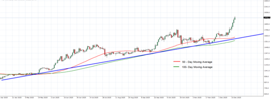 - DNEVNI POKRETNI PROSEK (MA) POTVRĐUJE UZLAZNI TREND: Cena platine i dalje se kreće iznad 50-dnevnog (crvenog) i 100-dnevnog (zelenog) pokretnog proseka, jačajući stabilnu strukturu uzlaznog trenda.