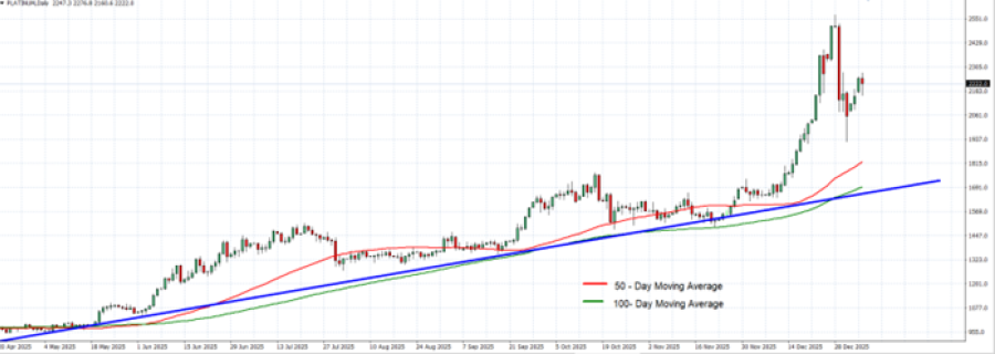 - KRETANJE CENA: Cena platine je dosegla najvišu razinu od 2,571.2 dolara (28. decembra 2025). Trenutno je cena platine oko 2,310 dolara, a ako dođe do potpunog oporavka, cene platine bi mogle porasti za 11%. Međutim, cena bi mogla i pasti.