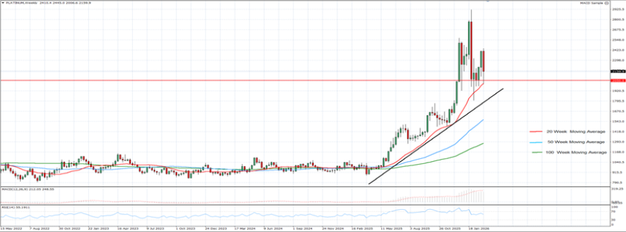 - SNAŽNA PODRŠKA I DALJE NA NIVOU 2050: Od decembra 2025. godine, platina je sedam puta testirala nivo 2050 i svaki put je odskočila i porasla.