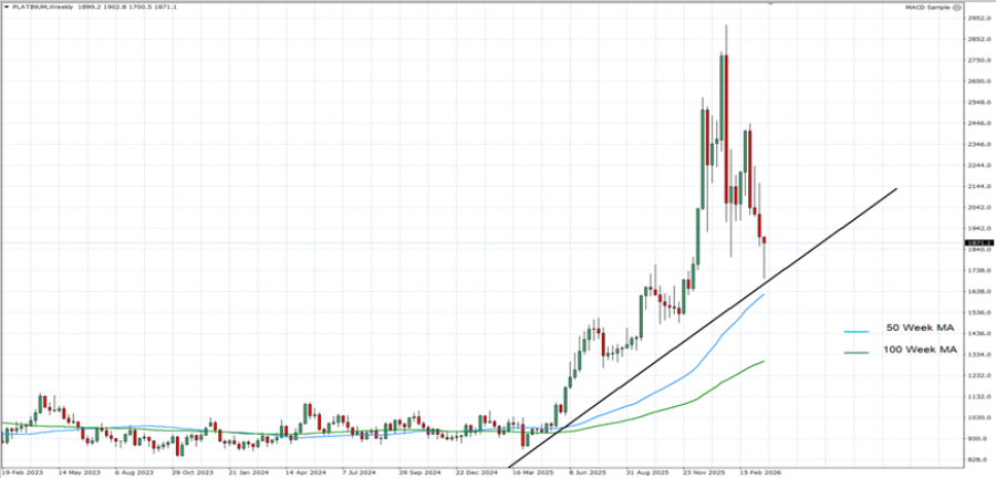 - KRETANJE CENA: Cena platine je dosegla istorijski maksimum od 2,920 dolara (26. januara 2026). Trenutno je cena platine oko 1,870 dolara, a ako dođe do potpunog oporavka, cena platine bi mogla da poraste za 1,050 dolara. Međutim, cena bi takođe mogla da se smanji.