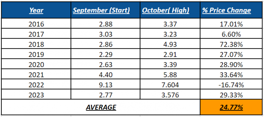 - SEZONSKI EFEKTI ISTORIJSKI UTIČU NA CENE PRIRODNOG GASA, DOVODEĆI DO RASTA CENA U PROSEKU ZA 24.77% OD NAJNIŽIH STOPA U AVGUSTU DO NAJVIŠIH U OKTOBRU (2016-2022): kao što je prikazano u donjoj tablici, prirodni gas obično poskupljuje između septembra i oktobra. To se uglavnom može pripisati rastućoj potražnji za prirodnim gasom tokom vrelih letnjih meseci (klimatizacija), poput jula i avgusta, te zabrinutosti zbog nestašice prirodnog gasa uoči zimske sezone koja počinje u oktobru.