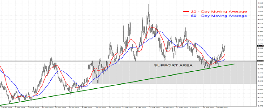 - PODRŠKA: 3,00 USD. Prema donjem grafikonu, cene prirodnog gasa su nekoliko puta testirale područje blizu nivoa od 3,00 dolara od novemba 2024. godine. Cene prirodnog gasa su veći deo vremena od novembra 2024. provele iznad nivoa od 3,00 dolara, što ukazuje na ograničen potencijal za pad.