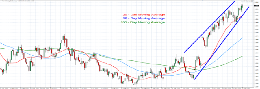 - DNEVNI POKRETNI PROSECI UKAZUJU NA UZLAZNI TREND: Prirodni gas se kreće iznad 20-, 50- i 100-dnevnih pokretnih proseka, što ukazuje na uzlazni trend. Ako cena padne ispod pokretnih proseka, trend se može preokrenuti.