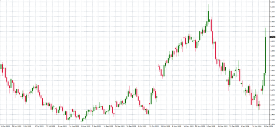 - NEDAVNI PROBOJ IZNAD JEDNOMESEČNOG RASPONA (21. JANUARA): Cene prirodnog gasa su porasle na 4,94 dolara, što je više od 25% u jednom danu, dosegnuvši najvišu stopu u više od mesec dana. Ovaj potez je pokazao poboljšanje kratkoročne dinamike. Međutim, cijena također može opasti.