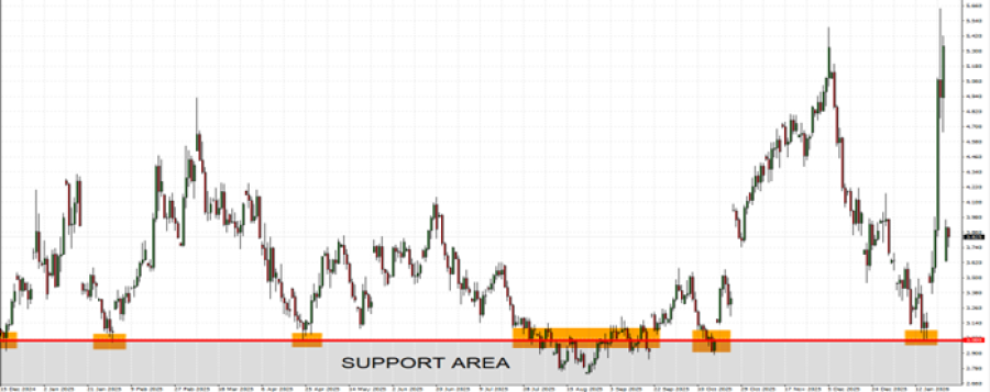 - PODRŠKA: 3 USD. Od kraja 2024. cene prirodnog gasa održavaju snažnu podršku na 3 dolara. Od kraja 2024. testirao je nivo od 3 dolara sedam puta, potvrđujući da je ta zona snažna podrška.