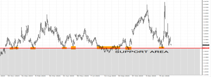 - Podrška: 3 USD. Od kraja 2024. prirodni gas je održavao snažnu podršku oko 3 dolara, testirajući ovo područje osam puta i potvrđujući ga kao snažno područje podrške. Međutim, cena bi takođe mogla da se smanji.