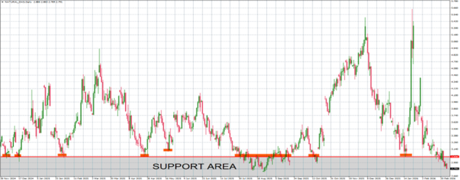 - ZONA PODRŠKE: 3 USD. Od kraja 2024. prirodni gas je održavao snažnu podršku oko 3 dolara, testirajući ovo područje osam puta i potvrđujući ga kao snažno područje podrške. Ovo je deveti put da se kreće blizu barijere od 3 dolara. Međutim, cena bi takođe mogla da se smanji.