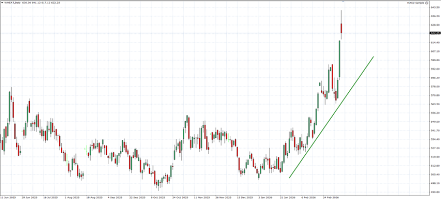 - UZLAZNI TREND OD JANUARA 2026: Od januara 2026. cene pšenice ušle su u snažan uzlazni trend, neprestano formirajući veće maksimume. Taj zamah nastavlja da gura cene prema gore, što ukazuje na stalni pritisak na tržište. Međutim, cena bi takođe mogla da padne.