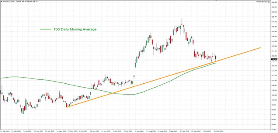 - UZLAZNI TREND OD MAJA 2025: Kao što je prikazano na donjem dnevnom grafikonu, Reddit nastavlja da se kreće iznad narandžaste uzlazne linije od maja 2025, potvrđujući trend rasta. Međutim, i dalje postoji rizik od potencijalnog proboja ispod narandžaste linije ako se promene tržišni uslovi.