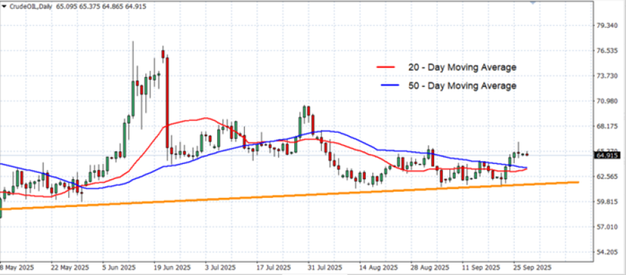 - DNEVNI POKRETNI PROSECI POTVRĐUJU UZLAZNI TREND: Cena sirove nafte se kreće iznad 20-dnevnog pokretnog proseka (crvena) i 50-dnevnog pokrentog proseka (plava), što ukazuje na kratkoročni pozitivan zamah.