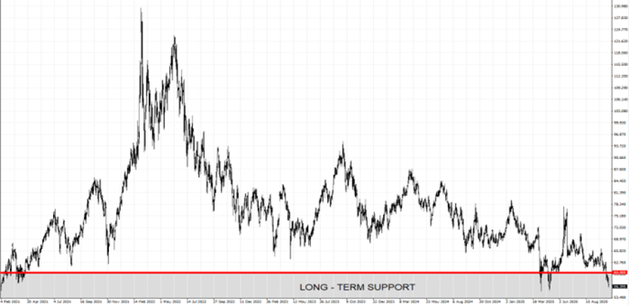 - ZONA DUGOROČNE PODRŠKE ISPOD PSIHOLOŠKE GRANICE OD 60 USD: Cena sirove nafte je nedavno testirala nivoe ispod 60 dolara, koji deluju kao zona podrške od početka 2021.