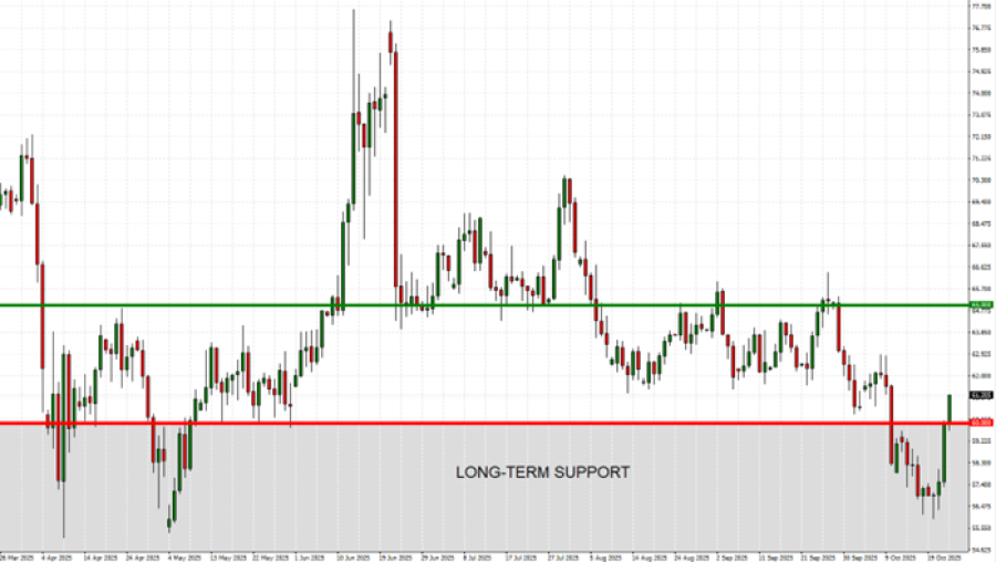 - KANAL U RASPONU 60-65 USD OD APRILA 2025. Prema dnevnom grafikonu u nastavku, od aprila 2025. cena sirove nafte uglavnom se kreće u rasponu od 60 do 65 dolara. Kanal pokazuje da nakon što cena sirove nafte dosegne nivo od oko 60 USD ili nižu, ona ima tendenciju daljeg rasta. Suprotno tome, kada cena sirove nafte dosegne 65 dolara ili više, ona ima tendenciju daljeg pada (izvor podataka: MetaTrader 4).