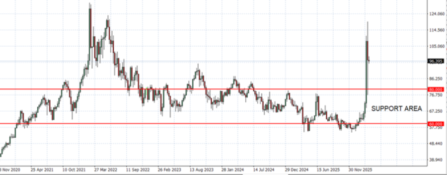 - ZONA PODRŠKE: 80 USD. Nakon što su porasle na najvišu stopu od juna 2022. (119,40 USD), cene sirove nafte sada su pronašle potporu na ili ispod 80 USD. Sirova nafta porasla je za oko 77% od početka rata, dosegnuvši cene koje nisu viđene u gotovo četiri godine i podigavši tržište iznad 80 dolara.