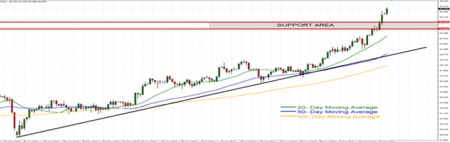 - ZONA PODRŠKE: 45 - 44 USD. Nakon postizanja novog 14-godišnjeg maksimuma (47.159 USD), cene srebra su nedavno porasle na 44-45 dolara, što je sada njihova sledeća psihološka podrška. Srebro se kreće oko 47 dolara. Međutim, i dalje postoji rizik od potencijalnog proboja ispod te razine ako se promene tržišni uslovi.