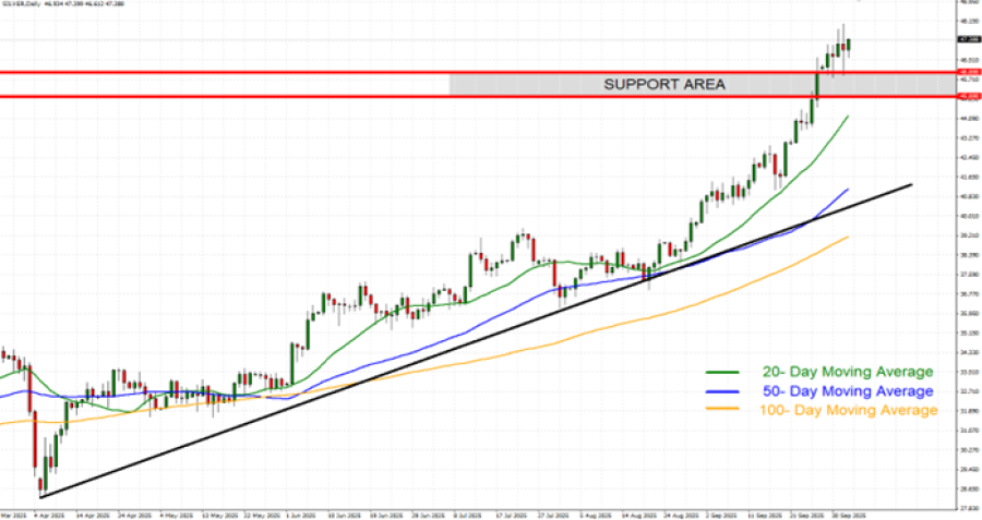 - ZONA PODRŠKE: 46 - 45 USD. Nakon postizanja novog 14-godišnjeg maksimuma (48.024 USD), cene srebra su nedavno porasle na 45-46 dolara, što je sada njihova sledeća psihološka podrška. Srebro se kreće oko 47 dolara.