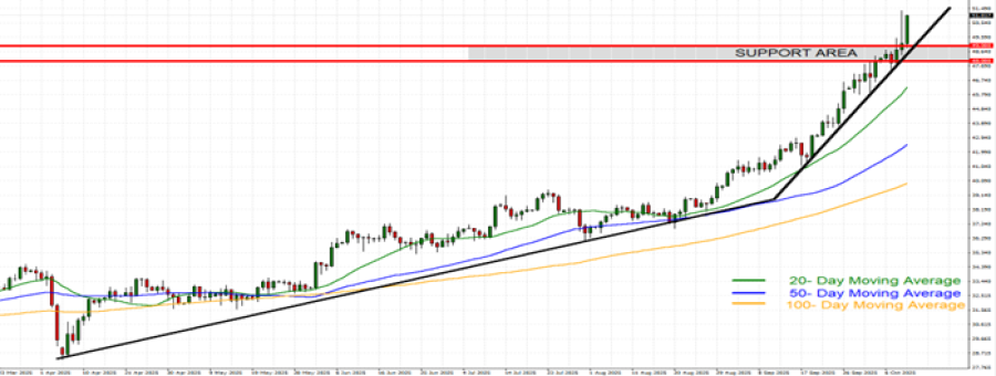 - SREDA, 15. OKTOBRA U 13:30 GMT+1: INFLACIJA U SAD (CPI) (SEPTEMBAR). Uprkos kontinuiranoj obustavi rada američke vlade, nedavni izveštaji sugerišu da bi podaci o inflaciji u SAD i dalje mogli biti objavljeni, a očekuje se da će kancelarijski radnici dodatno raditi na njihovom objavljivanju. U avgustu je inflacija u SAD porasla na 2,90%, u poređenju s 2,70% u julu. Ovo će biti poslednji izveštaj o inflaciji pre nego što Fed donese odluku o kamatnoj stopi 29. oktobra.