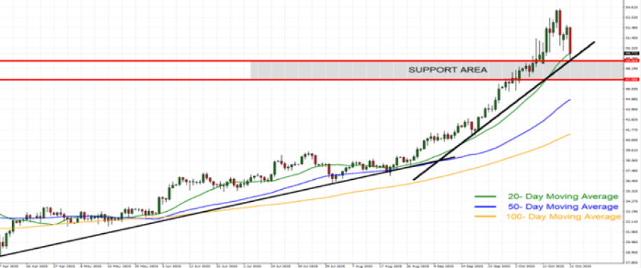- UZLAZNI TREND U 2025: Nakon pada cena u mart-aprilu, cene srebra od tada se kreću uzlaznim trendom, kao što je prikazano na donjem dnevnom grafikonu i punoj crnoj liniji uzlaznog trenda na istom grafikonu. Od početka 2025. cena srebra neprestano raste, dosegnuvši novi najviši nivo u oktobru (54.454 USD), što predstavlja rast od oko 88%. Međutim, cena takođe može i da padne.