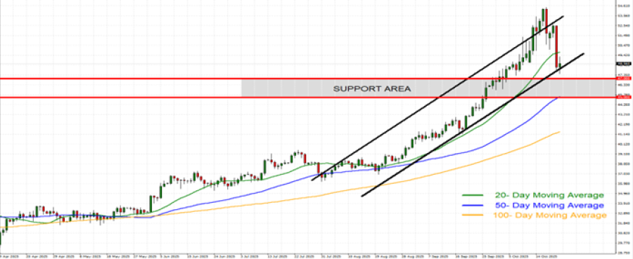 - UZLAZNI TREND U 2025: Nakon pada cena u martu-aprilu, cene srebra od tada se kreću uzlaznim trendom, kao što je prikazano na donjem dnevnom grafikonu i linijom uzlaznog trenda. Od početka 2025. cena srebra neprestano raste, dosegnuvši novi najviši nivo u oktobru (54.454 USD), što predstavlja rast od oko 88%. Međutim, cena bi takođe mogla da se smanji.