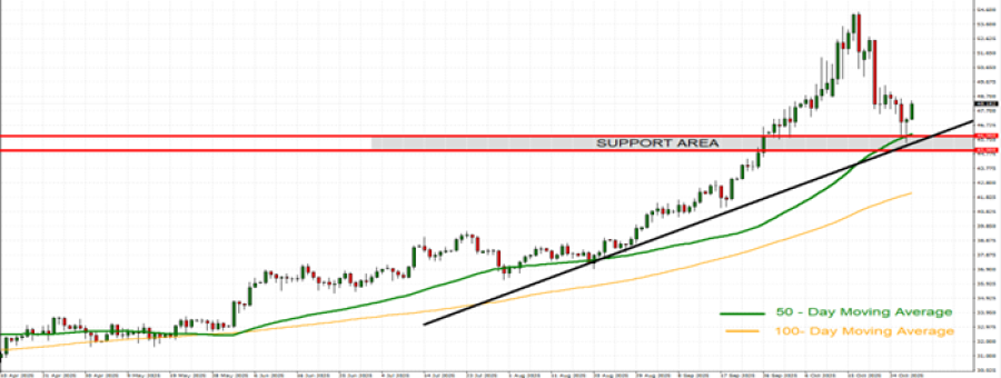 - UZLAZNI TREND U 2025: Nakon pada cena u martu-aprilu, cene srebra od tada se kreću uzlaznim trendom, kao što je prikazano na donjem dnevnom grafikonu i linijom uzlaznog trenda. Od početka 2025. cena srebra neprestano raste, dosegnuvši novi najviši nivo u oktobru (54.454 USD), što predstavlja rast od oko 88%. Međutim, cena bi takođe mogla da se smanji.