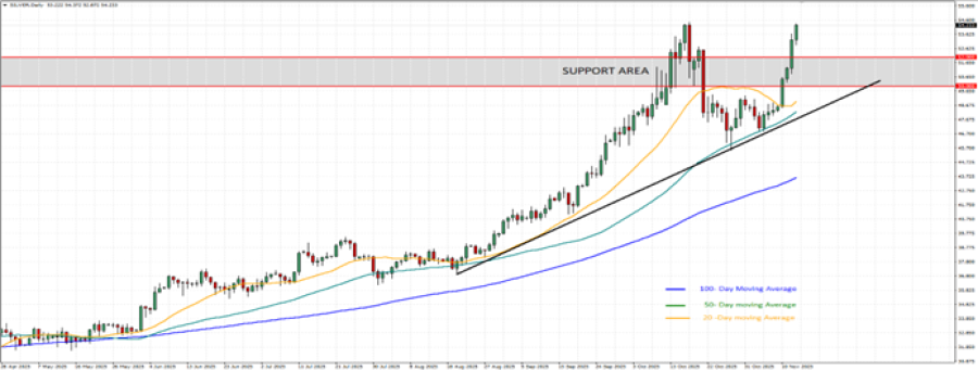 - UZLAZNI TREND U 2025: Nakon pada cena u martu-aprilu, cene srebra od tada se kreću uzlaznim trendom, kao što je prikazano na donjem dnevnom grafikonu i linijom uzlaznog trenda. Od početka 2025. cena srebra neprestano raste, dosegnuvši novi najviši nivo u oktobru (54.454 USD), što predstavlja rast od oko 88%. Međutim, cena bi takođe mogla da se smanji.