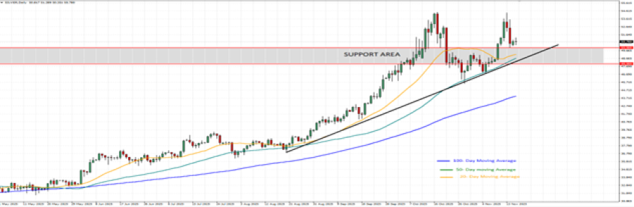 - UZLAZNI TREND U 2025: Nakon pada cena u martu-aprilu, cene srebra od tada se kreću uzlaznim trendom, kao što je prikazano na donjem dnevnom grafikonu i linijom uzlaznog trenda. Od početka 2025. cena srebra neprestano raste, dosegnuvši novi najviši nivo u oktobru (54.454 USD), što predstavlja rast od oko 88%. Međutim, cena bi takođe mogla da se smanji.